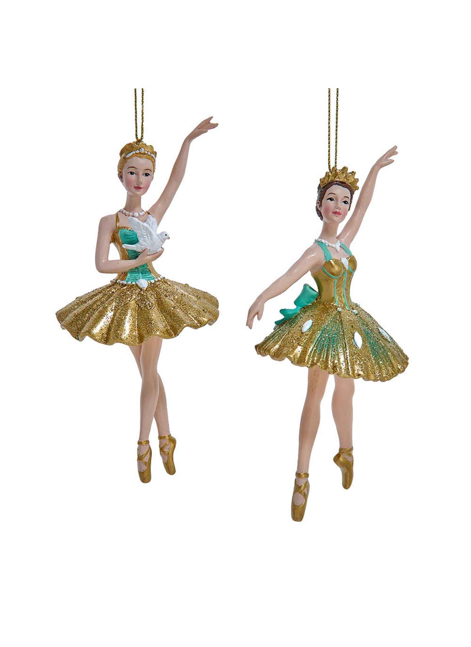 Elevate your holiday decor with Kurt Adler's enchanting Aqua & Gold Ballerina Ornaments, featuring two assorted designs! Each ornament beautifully captures the elegance of ballet, showcasing graceful ballerinas adorned in a stunning aqua and gold color scheme. Crafted with exquisite attention to detail, these ornaments bring a touch of sophistication and charm to your Christmas tree or seasonal displays. Lightweight and captivating, these ballerina ornaments are perfect for hanging on your tree, enhancing themed decorations, or gifting to dance enthusiasts and art lovers.
