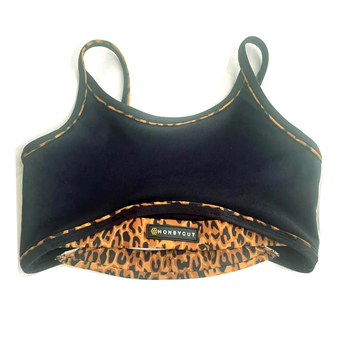 Make a huge impact with this classic bra top featuring contrast detail band at front and back plus contrast piping. Center front silicone HONEYCUT wordmark logo. Bonus: Interior pad pockets!