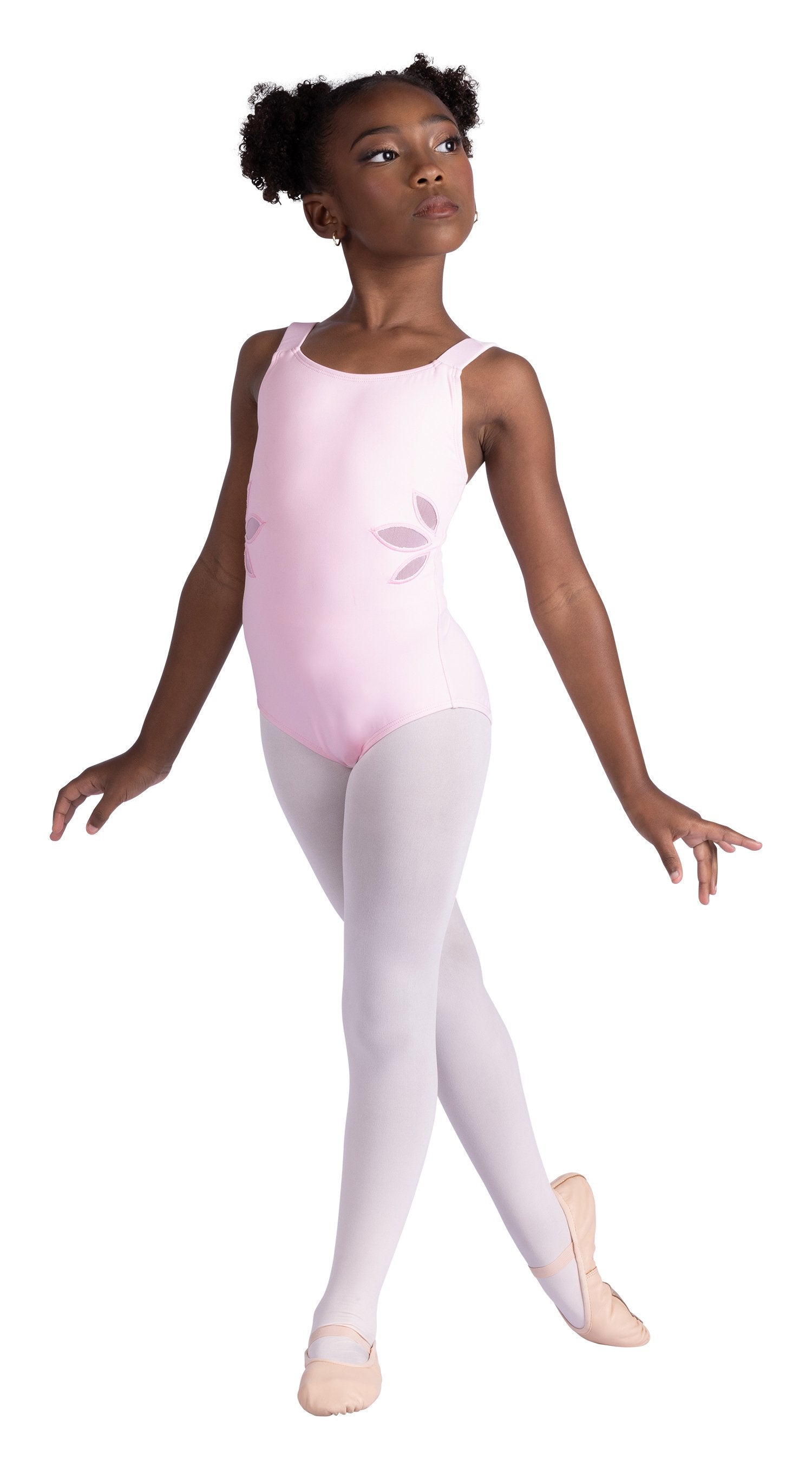 Wide, elasticized strap style tank leotard with floral side cut-outs backed with mesh. Fully front lined. Nylon/Spandex.