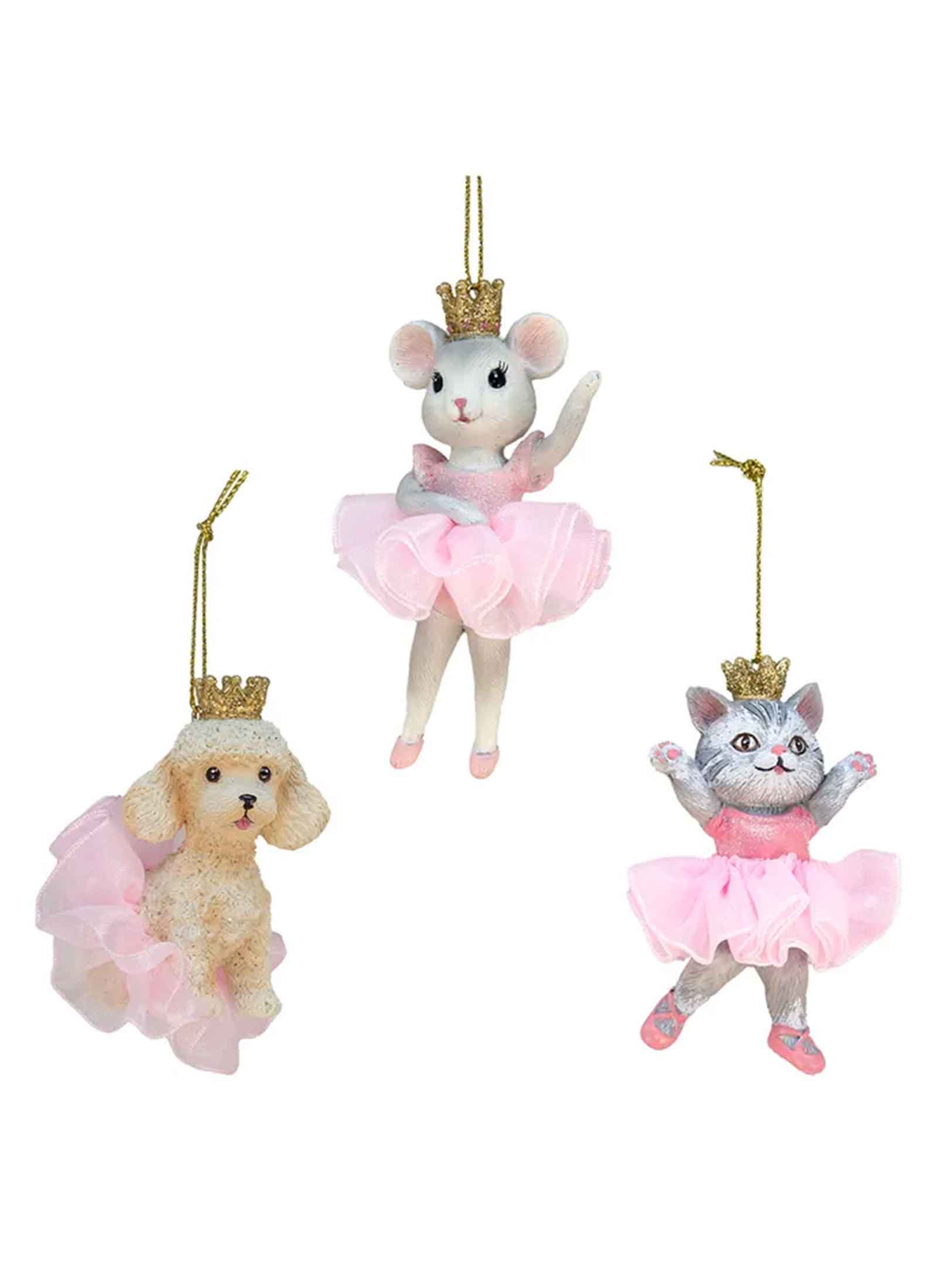 Add a touch of whimsy and charm to your holiday decor with Kurt Adler's delightful Pink Ballet Cat, Mouse & Poodle Ornaments! This enchanting assortment features three ornaments, each showcasing a whimsical character: a graceful ballet cat, an adorable dancing mouse, and a stylish poodle in ballet attire. Their vibrant pink hues and intricate details bring the world of dance to life, making these ornaments perfect for animal lovers and ballet enthusiasts alike. Crafted from high-quality materials, these lightweight ornaments are ideal for hanging on your Christmas tree, adorning garlands, or using as delightful accents in your festive displays.