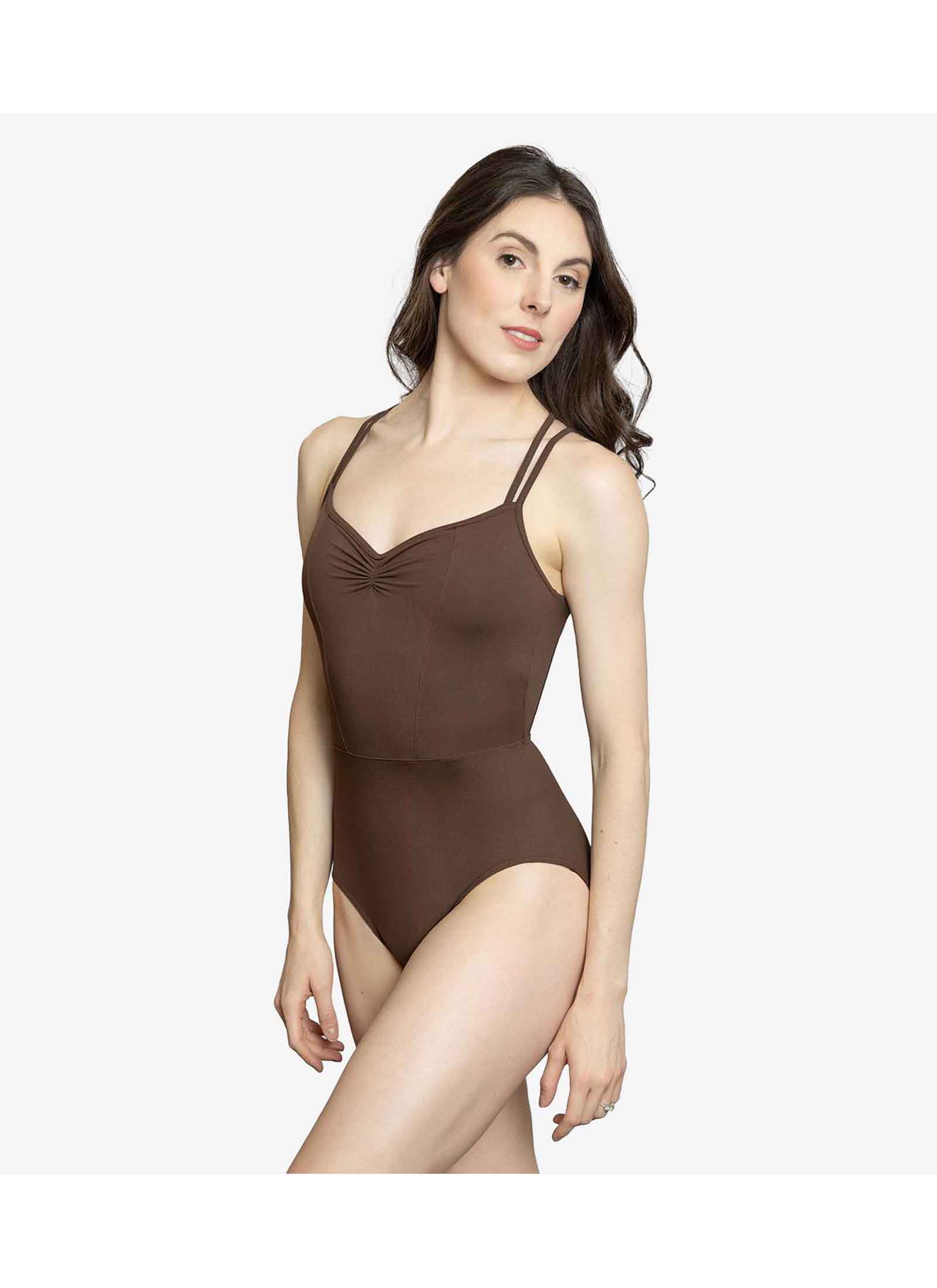 Adult camisole with rushed front detail and double strap design. A keyhole open back with intersecting straps.