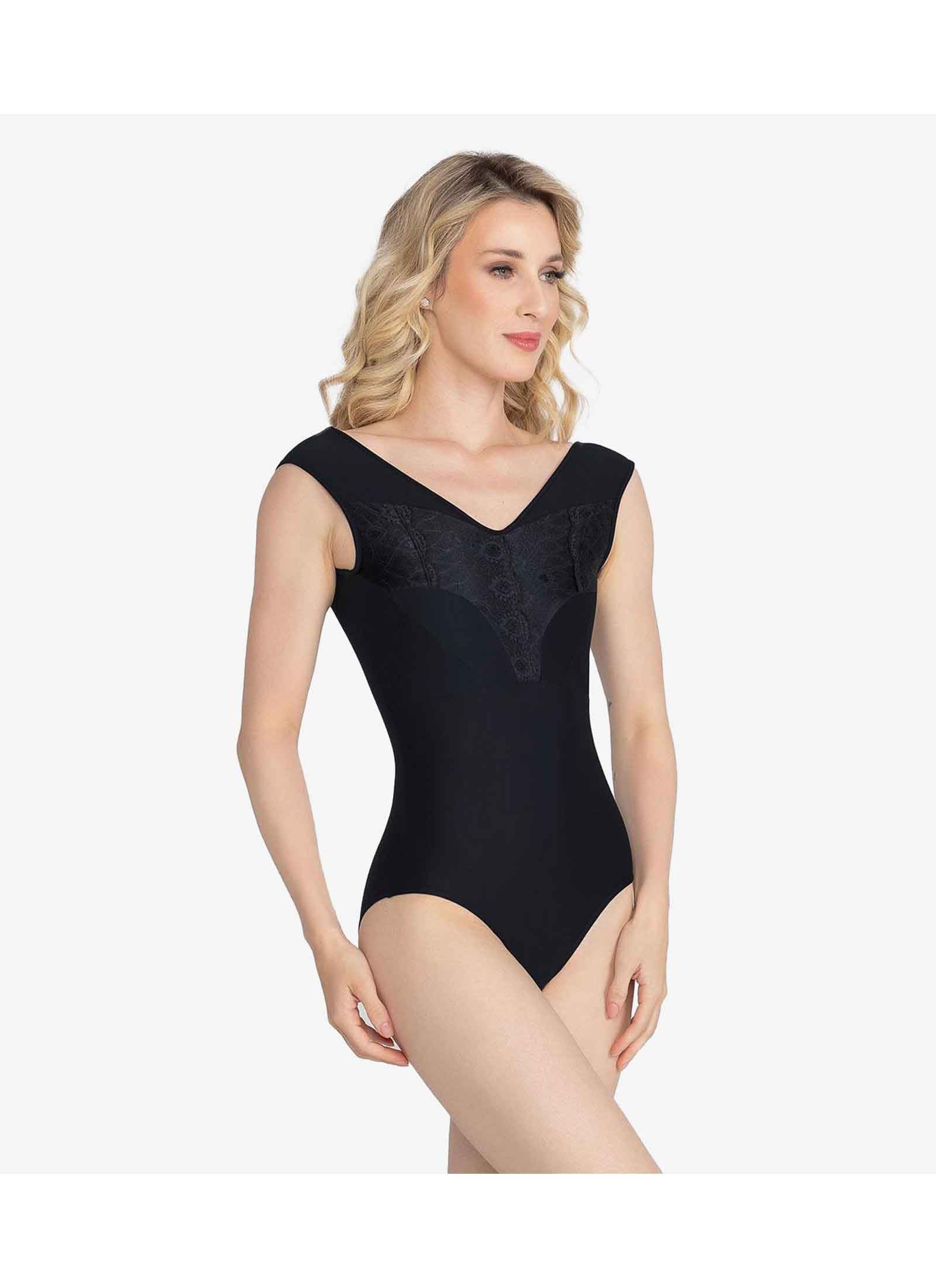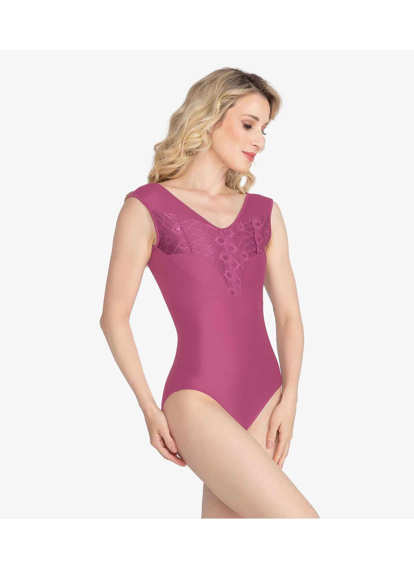 Adult wide-strap leotard with a V-neckline and lace overlay on the bodice. Features a deep V-back