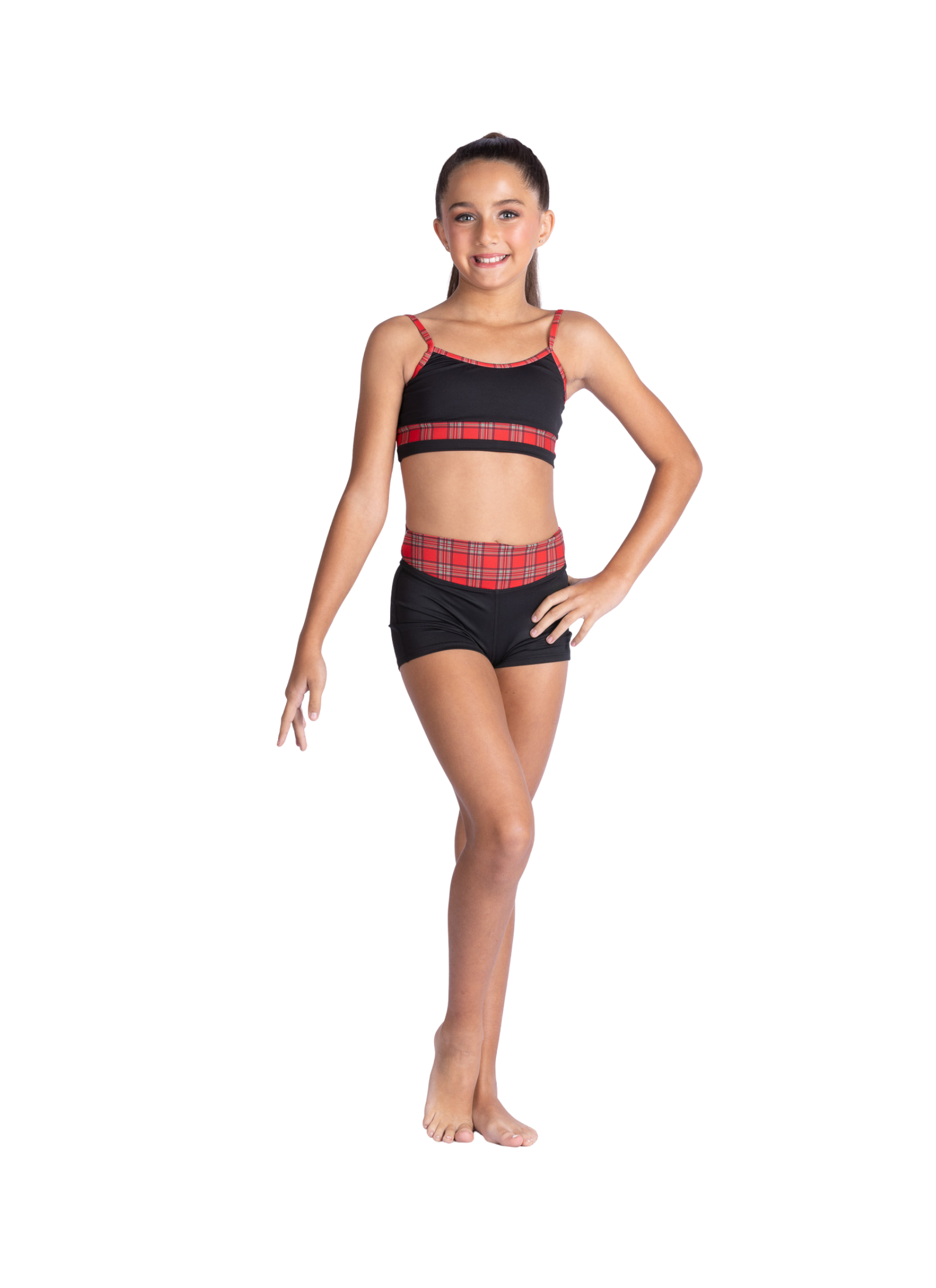 Classic meets festive! The Holiday Plaid Top features black fabric with tartan plaid accent strips.